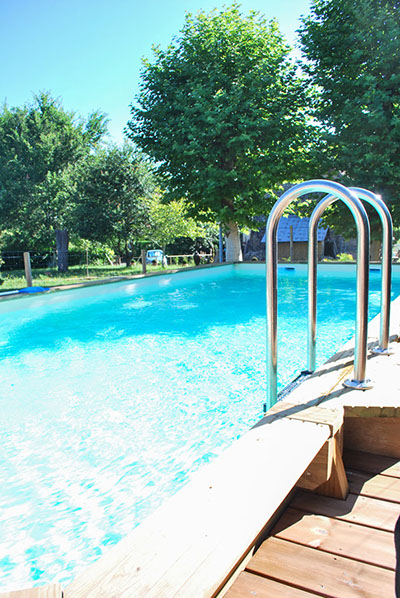 Côté piscine • une eau telle la rivière, douce et naturelle, terrasse en bois et tout le confort pour s'y détendre