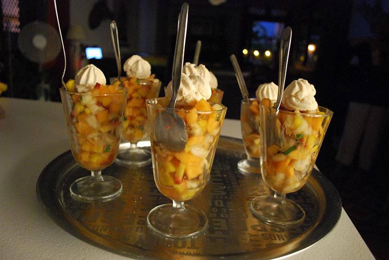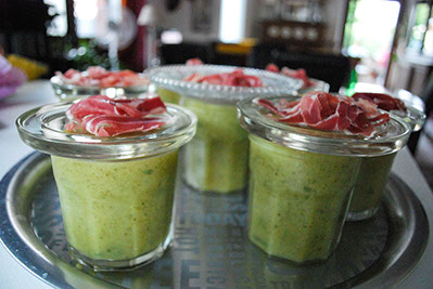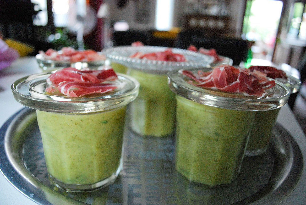 Soupe froide courgettes citron et coupelle de jambon du pays