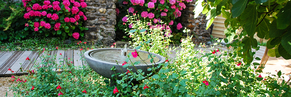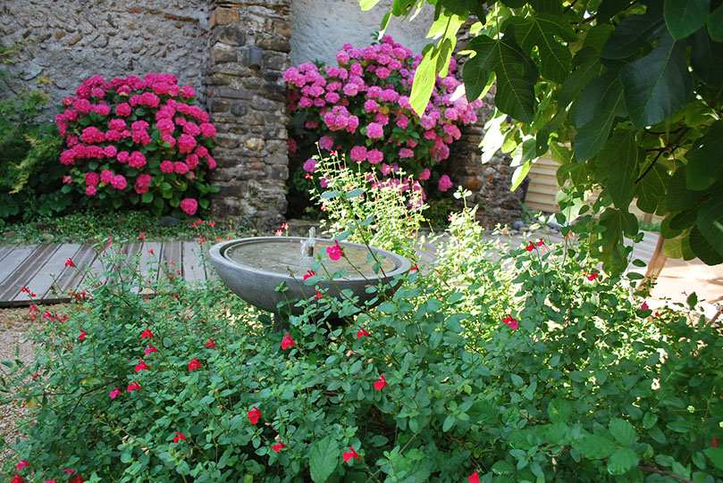 … avec vue sur le jardin, havre de verdure paisible et chant des oiseaux