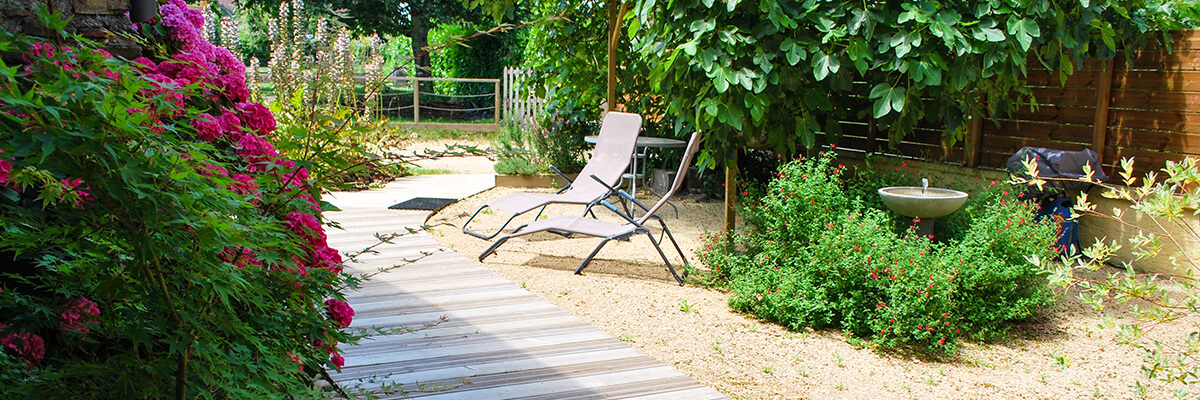 Entrée du gîte • Terrasse avec chaises longues sous le figuier