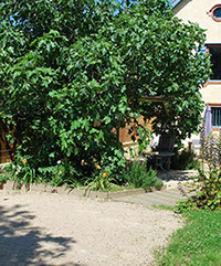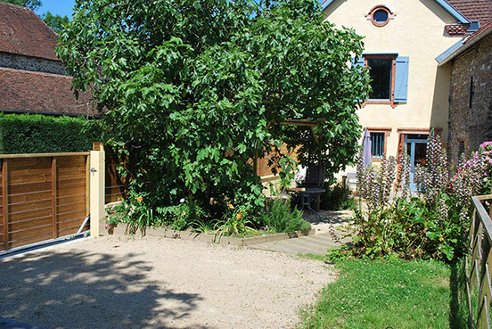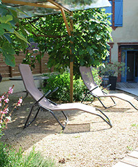 Entrée du gîte • Terrasse avec chaises longues sous le figuier