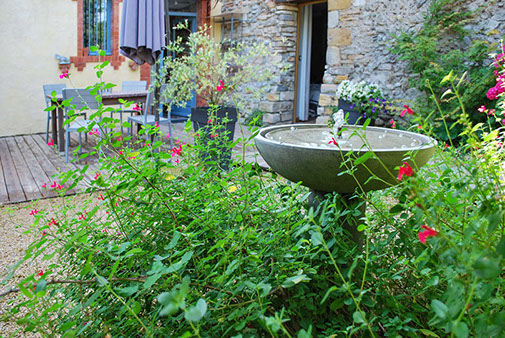 … avec vue sur le jardin, havre de verdure paisible et chant des oiseaux