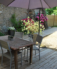 • Cour privée d'environ 100m2 comprenant, une terrasse en bois de 25 m2, table et salon de jardin, relax, parasol et détente ombragée et aménagée sous le figuier